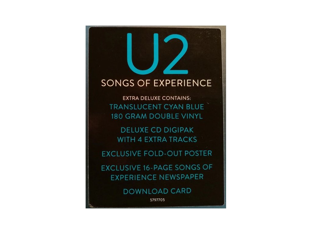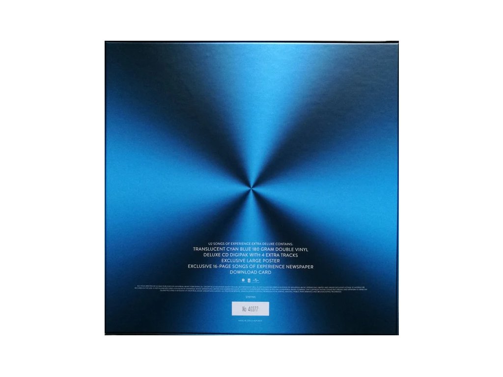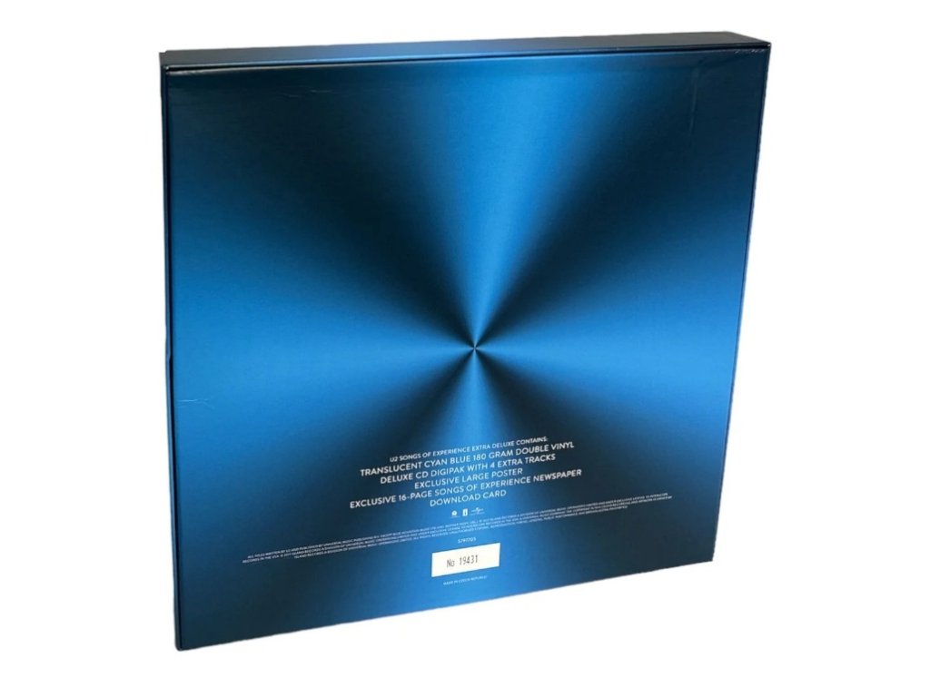 2Lp + CD / 180g / Exclusive Blue Edition / Extra Track / Newspaper Vlastnosti:• Číslovaná, limitovaná edice• 12" pevný box• Dvojité LP a Deluxe CD• Průsvitný azurově modrý 180g vinyl• Exkluzivní rozkládací plakát• Exkluzivní 16stránkové noviny Songs of Experience• Karta ke stažení na omezenou dobu• Deluxe CD Digipack se 4 extra skladby• „You're the Best Thing About Me“ (U2 vs Kygo) – exkluzivně na CD Deluxe Edition • Výběry Selections:2LP:Side 1:1. Love Is All We Have Left2. Lights Of Home3. You're The Best Thing About Me4. Get Out Of Your Own Way5. American SoulSide 2:1. Summer Of Love2. Red Flag Day3. The Showman (Little More Better)4. The Little Things That Give You AwaySide 3:1. Landlady2. The Blackout3. Love Is Bigger Than Anything In Its Way4. 13 (There Is A Light)Side 4:1. Ordinary Love (Extraordinary Mix)2. Book Of Your Heart3. Lights Of Home (St. Peter's String Version)Deluxe Edition CD:1. Love Is All We Have Left2. Lights Of Home3. You're The Best Thing About Me4. Get Out Of Your Own Way5. American Soul6. Summer Of Love7. Red Flag Day8. The Showman (Little More Better)9. The Little Things That Give You Away10. Landlady11. The Blackout12. Love Is Bigger Than Anything In Its Way13. 13 (There Is A Light)Bonus Tracks:14. Ordinary Love (Extraordinary Mix)15. Book Of Your Heart16. Lights In Front Of Me (String Arrangement)17. You're The Best Thing About Me (U2 vs. Kygo) (exclusive to Deluxe CD)Doplňkové parametry