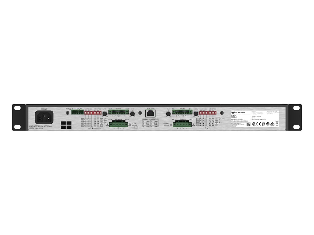 Efektivní čtyřkanálový ClassD zesilovač s dynamickým přidělováním výkonu PowerTANK. Celkem 600W je možné podle potřeby rozdělit do čtyř koncových stupňů a optimalizovat tak pro účel dané instalace (například 150W L, 150W P, 250W sub a 50W 100V dokrytí). Díky technologii EcoRAIL zesilovač zbytečně neodebírá proud ze sítě, pokud nemusí (bez signálu méně než 1W). Další vlastnosti: vestavěné filtry (HPF/LPF na všech kanálech), kaskádování Amp-LINK (dle AES72-1E), převážně konvenční chlazení (nehučí), buzení 4/8 ohm nebo 100V linky (VLD), účinné ochrany a především absolutní spolehlivost značky DYNACORD.Doplňkové parametry