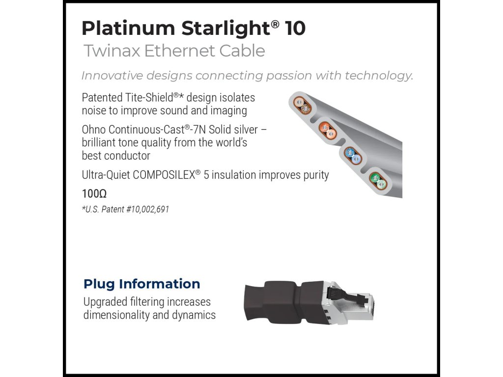 Wireworld Platinum Starlight 10 je náš nejlepší špičkový ethernetový kabel a také nejlepší dostupný. Tento pokročilý 23AWG ethernetový kabel používá stejný patentovaný trojitý stíněný design jako Starlight, ale vodiče jsou upgradovány na OCC-7N Solid Silver, nejvodivější a zvukově nejprůhlednější kov na světě. Zlepšení oproti Starlight je podstatné, prakticky vše zní poutavěji a živěji. Upgrade z Platinum Starlight 8 na Platinum Starlight 10 přináší významné vylepšení, jehož výsledkem je pozoruhodný sluchový zážitek, kde každý zvuk rezonuje s větším soustředěním, hloubkou a živostí.