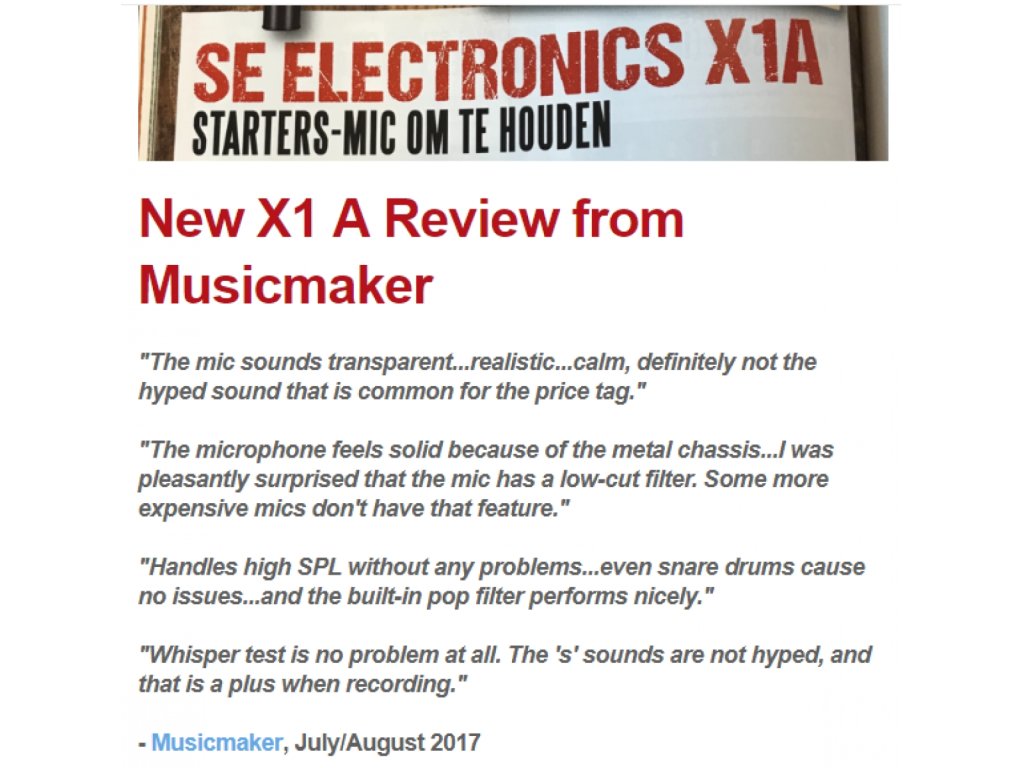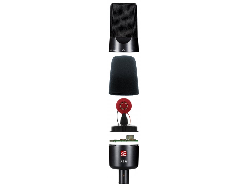 Kondenzátorový mikrofon s kardioidní vložkou zkonstruovaný jako univerzální mikrofon pro nahrávání zpěvu či nástrojů v menších a domácích studiích, kde není možné mít širší výběr různých modelů. Je zkonstruován tak, aby nezdůrazňoval protivné sykavky a přitom jeho zvuk nepostrádal detaily potřebné pro prosazení zpěvu v mixu. Zvláštní pozornost při konstrukci mikrofonu sE X1 A byla věnována směrovosti, jejíž odezva je unifikovaná až do poměrně vysokých kmitočtů. Díky kardioidní směrové charakteristice je mikrofon schopen do velké míry odstínit ozývající se místnost. Kmitočtový rozsah mikrofonu je vyrovnaný v oblasti 20Hz-20kHz s tolerancí +/-2dB. Jemným 2dB zdvih v oblasti nad 10kHz (viz přiložený graf) slouží ke kompenzaci útlumu studiového pop-filteru na nejvyšších kmitočtech. Mikrofon je osazen zapínatelným útlumovým článkem -20dB, takže se s ním nemusíte bát nahrávat i silné hlasité nástroje jako je elektrická kytara nebo bicí (max SPL je 150dB). Hluboké rušivé zvuky (např. hluk aut v ulici ap.) lze navíc odstranit vestavěným HPF filtrem. K mikrofonu X1 A je dodáván pevný mikrofonní držák (odpružený s integrovaným Pop-filterem lze dokoupit zvlášť pod označením "sE Isolation Pack"). Připojení k mixu či předzesilovači standardním třípinovým XLR konektorem, vyžaduje samozřejmě phantomové napájení, ale díky předpolarizované vložce mu stačí i 12V, takže nebude problém ho provozovat ani s USB zvukovkami.Doplňkové parametry